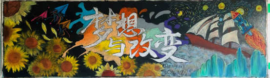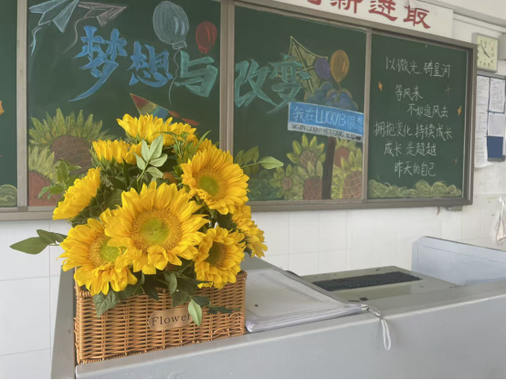 前黑板也延续了向日葵元素,并加入风筝、气球与星星装饰,左右分别书写关于“梦想”与“改变”的文字,为教室注入了更多生机与活力。