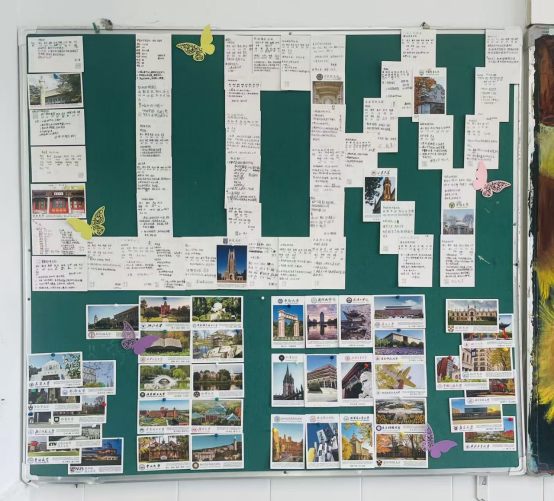 完成黑板报后,同学们又将目光投向空白的粘板。通过反复测量与尝试,最终以一张张明信片拼出“LUCKY13”字样,既彰显个性,也凝聚了集体的创意与梦想。