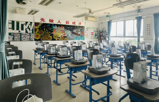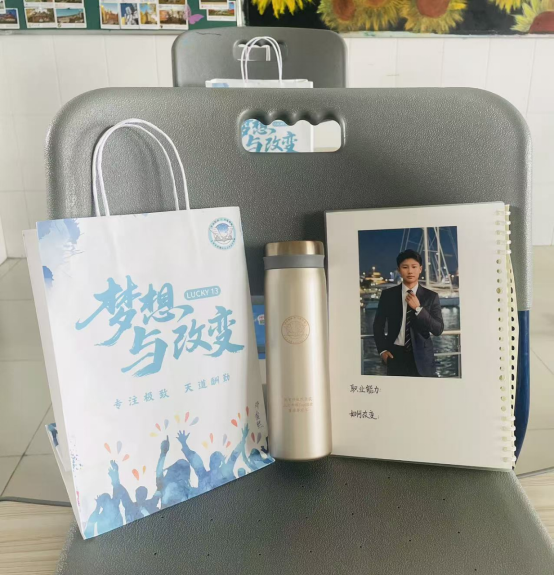更让同学们惊喜的是,张老师和家委还为大家准备了意义非凡的开学礼物。每个座位上都放有定制纸袋,里面有印着个人奖项的保温杯、写有AI生成未来职业图像的物理笔记本,以及JOY从美国带回的糖果。每一份礼物都承载着深切的祝福与期待。