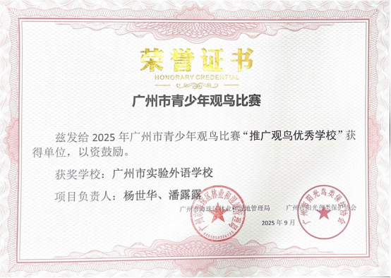 近日,由广州市海珠区林业和园林局与广州市阳光鸟类保护协会共同主办的“2025年广州市青少年观鸟比赛”圆满落幕。我校在本次比赛中表现突出,荣获“推广观鸟优秀学校”单位称号,并在海珠湿地公园进行了颁奖仪式,这充分展现了我校在自然教育、生态保护和科学实践方面的卓越成果。