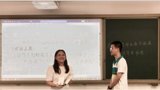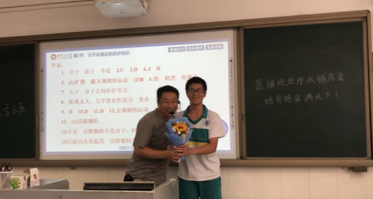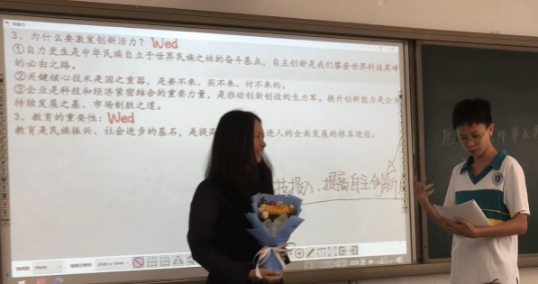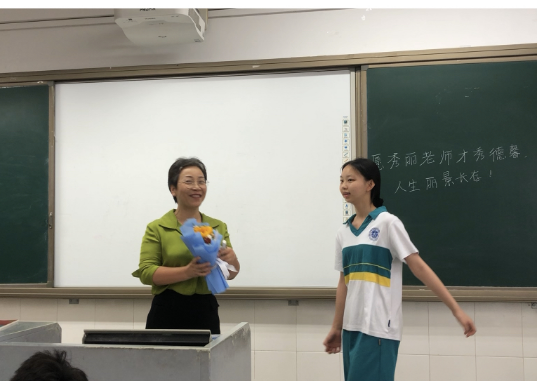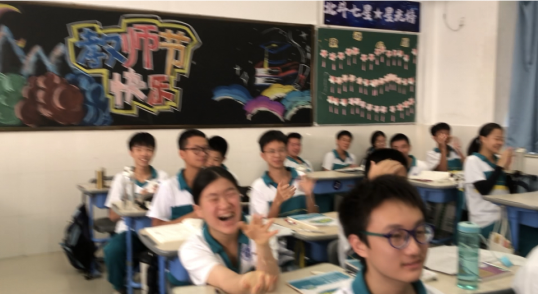 教师节当天,我们为每位老师准备了独具学科特色的祝福。仲元同学即兴发挥,给语文老师送去富有诗意的祝福;凯欣诵读自创散文诗,表达对历史老师的敬意;子衡同学给数学老师送上的祝福是,愿"我们对您的爱就像三角形一样稳定"的真情告白,在集体送上"Happy Teachers' Day"祝福后,云舒全英文发言,表达对英语老师的敬意。维熙给政治老师的感激之意,体现思想觉悟的升华;元泰用化学属于和实验现象表白化学老师;林杰给老马的祝福最时尚,有舞蹈有Rap。还有全班同学给老师送上嵌入老师姓名的祝福。虽然形式简单,却饱含着我们最真诚的感恩之心。