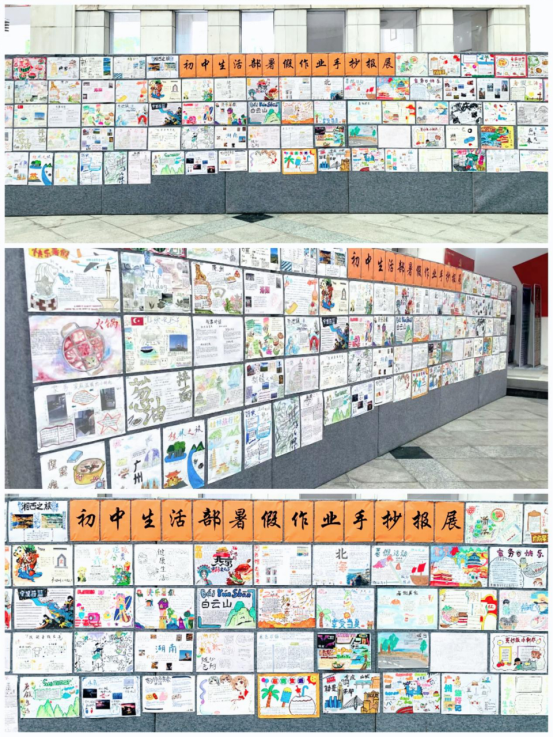 初中生活部举办了关于“我的暑假”的手抄报活动,共赏美景分享趣事。把人文景点、特色美食等融进画纸,用彩色画笔定格暑假的专属回忆。每位同学匠心独运的手抄报都展示在了中庭,让老师同学们品味不同的风采。