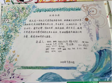 最后,我们庄严地举行了新一届班委集体承诺活动,相信31位班委一定会践行承诺,在服务班级中提升自己的管理能力。我们一起期待,新一届班委携手全班同学,共同将初二Lucky13打造成一个更加团结、更有凝聚力的优秀班集体。