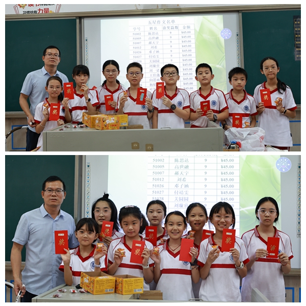 最后,典礼迎来了高潮——上学期五星作文的颁奖。有多名同学凭借9篇佳作摘得桂冠,而令人欣喜的是,全班每位同学都至少有一篇作文获得了五星评价,展现了大家在文学创作上的共同成长与进步。