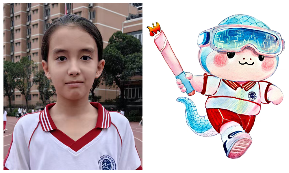 设计说明:广州市实验外语学校第27届运动会吉祥物“小智”,是一只智慧的小蛇,它佩戴充满未来感的科技眼镜,寓意学校以科技视野锚定未来,推动体育与创新深度交融;紧握的火炬,既呼应广州即将举办全运会的氛围,又承载着广外数十年积淀的体育精神、文化底蕴与科技追求,如星火般在代代学子手中传递;小蛇奋力奔跑的姿态,既彰显运动赛场“超越自我、奋勇拼搏”的蓬勃朝气,更诠释出学校运动精神与文化传承在科技赋能下,于时光长河中生生不息、奔涌向前的动人形象。