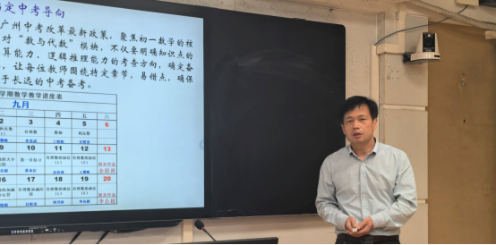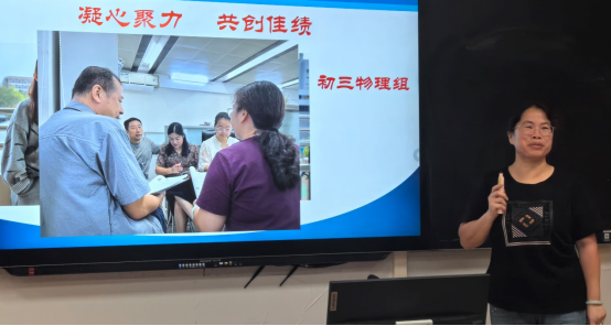 初一数学组余青训老师紧随其后,分享了初一数学备课组的经验。数学备课组在集体教研中会明确备课目标,锚定中考导向,提前准备,精准分工。每次备课前一周,确定主备人及备课主题,主备人提前撰写详细的备课草案,发挥集体优势,助力新老师尽快适应环境,让每一次学习都有更多收获,让每一次集体备课都能更多助力教学。