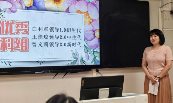 初三英语组郭桂芳老师一上台就给全场一个“suprise”.她用AI技术把“白利军老师”请到现场介绍自信的英语组团队惊艳全场,会场的气氛瞬间欢快起来,紧接着她介绍了初三英语备课组的团队合作原则,坚持四个自信的立场,发挥示范带学的作用,以实现目标导向实践,据效果评价优化方案,推进资源开发与共享。最后她在现场演绎了AI技术在教学中的应用,让现场评委和老师们深刻感受到了AI的教育力量。