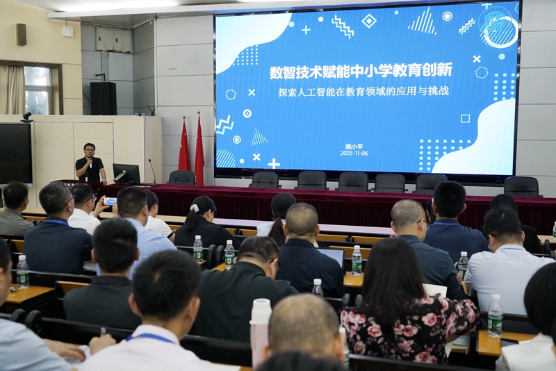随后,全体人员在中学阶梯教室观看学校宣传片。学校党委书记魏传文介绍了学校办学历程与发展近况。在智慧校园主题交流环节,姚小平老师作《数智技术赋能中小学教育创新》专题报告,系统呈现学校在人工智能教育应用方面的探索与实践,引发热烈反响。