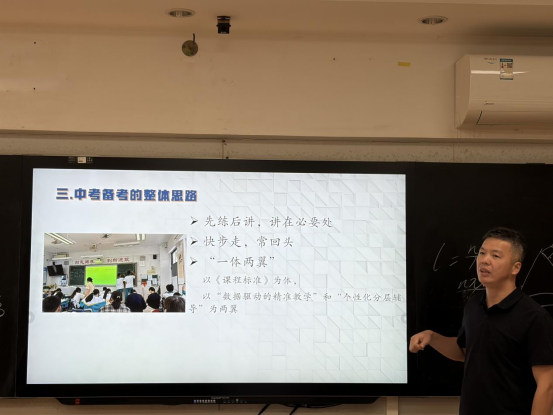 人常说:学好数理化,走遍天下都不怕,得数学者得天下,近年来,国家也高度重视数学教育,广州市、白云区也多次组织数学高质量发展论坛及学科素养赛事活动,广实外校自1993年建校以来,在主打外语特色的基础上,也一直不断强化数理科创学科建设,初中数学组获评白云区优秀科组,集团学情调研单科排名前列, 2024年培养出中考广州市唯一单科满分,实属不易。会议特邀广实外校初中数学组现任科组长王位锦以《系统规划,精准施策,协同赋能》为题开展经验分享。他分享了数学组教学现状、中考数学的新变化及中考备考的整体思路。他设计出中考数学三轮复习的详细规划,并且从科学教研、作业批改、培优培尖强基、心理支持和考前模拟支持五个方面为抓手落实规划。