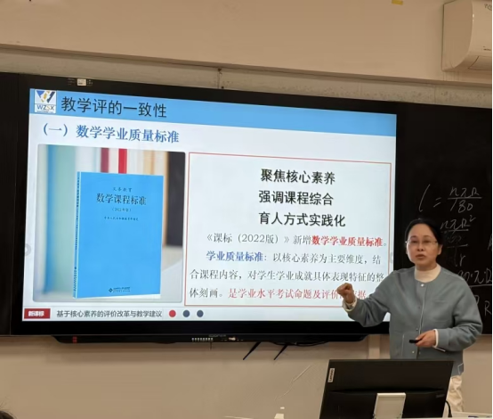 多年深耕中学教研一线,引领全市中学数学教研大方向的中学数学正高级教师、广州市教育研究院中学数学教研员伍晓焰从百忙之中莅临现场,全程参与此次教研活动。伍老师发言中首先结合课例,给予研讨课堂上呈现的生本教学模式给予积极肯定,进而以《基于核心素养的评价改革与教学建议》为题开展讲座。