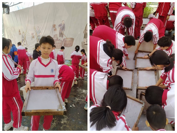 上午十一时,师生转入非物质文化遗产体验区,开展古法造纸实践课程。该课程以东汉蔡伦造纸工艺为蓝本,配备了完整的传统造纸工具组,包括纸浆池、抄纸帘、压纸板及晾晒架等设施。现场指导人员介绍了古法造纸的方法流程,提醒孩子们抄纸成型时“入水角度、匀速起帘、均匀震荡”等关键技术动作。实际操作中,学生每人一个抄纸帘,他们用纸帘从纸浆池中抄起薄薄一层纸浆,轻轻晃动让纤维均匀分布,最后脱水晾干,看似简单的过程,实际操作却需要极大地耐心和技巧。学生在动手实践中同步了解了造纸术对人类文明发展的重要意义。