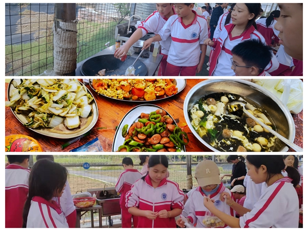 正午时分,最令人期待的分组炒菜活动开始了。十二个班级划分为七十二个烹饪小组,每组配备独立土灶台、基础厨具及新鲜食材。研学前各班学生已分好组,分好工,班主任进行烹饪安全培训,包括灶火管理、刀具使用及食品安全规范。各小组快速进入实操环节:生火组学习柴火排列与通风控制技巧;食材处理组练习蔬菜清洗、切割及配菜准备;烹饪组掌握油温判断、调味顺序及火候调节等基本技能。油锅的噼啪声、铲子的翻炒声和孩子们的惊呼声、欢笑声交织在一起,汇成了一曲热闹的厨房交响乐。与去年研学烹饪相比,这次操作熟练度提高,各小组有序分工合作。有的学生还创新地将上午收获的红薯用锡纸包裹,放入灶火中烧烤。当孩子们将亲手制作的菜肴摆上餐桌时,香气扑鼻,成就感洋溢在每个孩子的脸上。用餐结束后,各小组清洗、整理、归位厨房区域,完整实践了从准备到收尾的餐饮工作全流程。