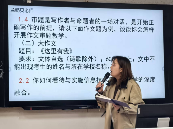 孟懿贝老师结合课堂实践谈论作文审题教学,并针对“信息技术与教育教学的深度融合”展开辩证思考,提出“见天地,见众生,见自我”的语文学习目标。