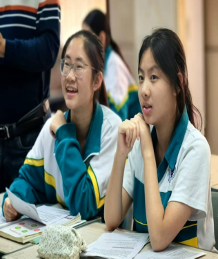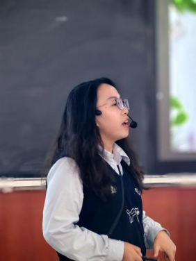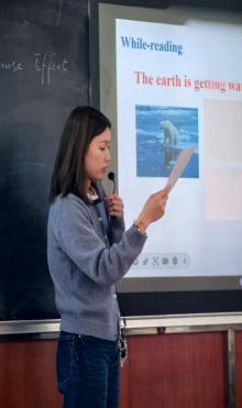 紧随其后,骆楚琪老师带来了一堂课外拓展课题课 ——greenhouse effect(温室效应)。课堂伊始,骆老师通过针对性提问,先精准检测了学生对前置知识的掌握程度;随后以问题为牵引,层层拆解文章逻辑,逐步为学生梳理出清晰的文本结构;课堂尾声,她组织学生开展小组合作,以 “如何保护环境” 为主题进行成果展示,实现了知识输入到实践输出的闭环。此外,在课后答辩环节,面对 “人工智能能否取代教师” 这一议题,骆老师给出了极具教育温度与人文关怀的回答,其教育理念与职业情怀给在场人员留下了深刻印象。