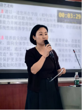 随后的“综合素养·即时答辩”环节,选手现场抽取题目,围绕学科专业知识和教学理念展开陈述。题目涵盖核心素养落地、AI对教学的赋能、教学评一体化如何落实等前沿教育话题,考验教师的即时反应、理论功底与表达能力。参赛教师们沉着应对、观点鲜明,展现出新时代青年教师的教育思考与专业追求。