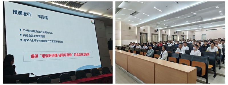 2025年12月4日,我校特邀广州健康城市促进会副秘书长、高级食品安全管理师李霞莲女士莅临指导,开展校园食品安全专项审查工作。李教授对我校食堂进行了细致的检查与评估,并于晚上在中学生阶梯教室对全体食堂员工进行了“筑牢校园食品安全防线”专题培训。校领导黄巧萍、李悦明,总务主任王一臣参加了培训。