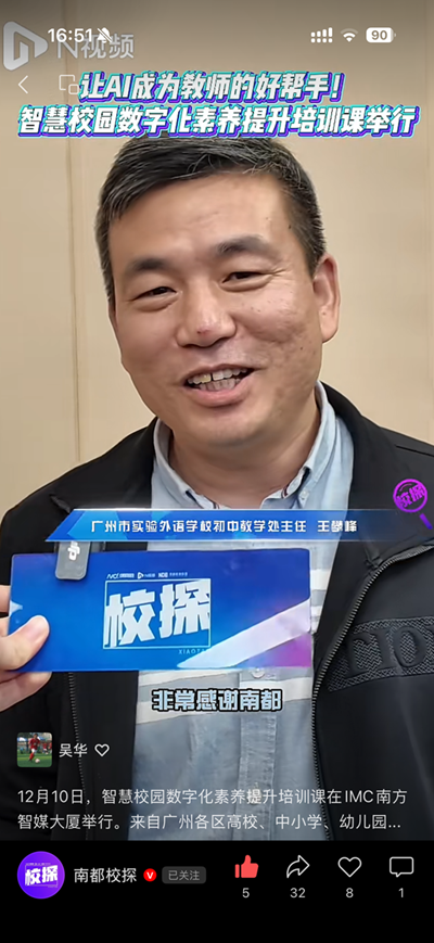 我校初中教学处主任王攀峰在培训结束接受南都采访时表示,回到学校后,他将积极运用今天所学的技巧和知识,并把这些技巧在校内推广给更多老师,让AI更高效地赋能教学,助力学校教育高质量发展。