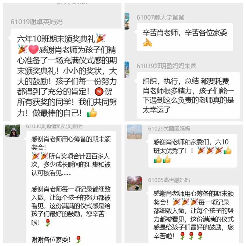 1月18日周日晚,六(10)班在教室里成功举行了本学期期末综合评奖盛典,对在学习成绩、纪律、作业等多方面表现优秀的同学进行了表彰,营造了积极向上、你追我赶的良好学习氛围。此次评奖涵盖全勤奖、班级的活动(小作家颁奖、听写大赛、古诗默写比赛)、学科成绩、常规表现、各项作业等多个角度,全班共计400人次获奖。许多同学凭借自己付出的努力收获满满,最多的同学获奖次数达到20来次。部分家委来校协助颁奖,共同见证了六(10)班孩子们的成长与进步。