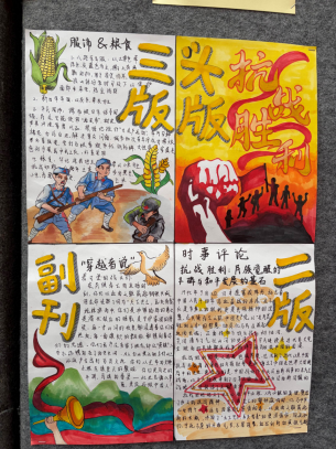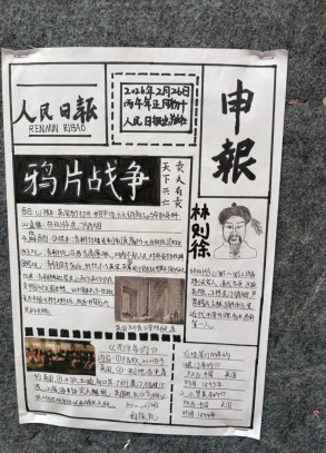 同学们拿起画笔与钢笔,仿佛我们真的“穿越”了。有人回到1915年,在《新青年》报头下写下“德先生、赛先生,今日抵沪”;有人定格1937年,用《救国时报》的号外发出“卢沟桥的枪声”;还有人回到1949年,在《曙光日报》上宣告“天安门城楼上的庄严声音”。每一份报纸,都有我们精心设计的报头、用心绘制的配图、反复斟酌的标题。我们尝试走进历史人物的内心:在二版“专访”鲁迅先生,听他讲“横眉冷对千夫指”的铮铮铁骨;在三版“社会生活”里,还原那个年代的歌谣与衣衫,触摸战火中的烟火人间;在四版“副刊”上,我们以“穿越者”的身份,给林则徐写一封信,用漫画勾勒出百年兴衰的时间轴。