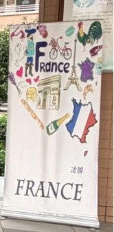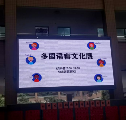 活动还未正式开始,现场就已被精心布置。汇聚了各个国家代表元素的精美的PPT在中庭展示,同时播放着各语种精心挑选的暖场歌曲,让人仿佛瞬间穿越到了异国他乡。
