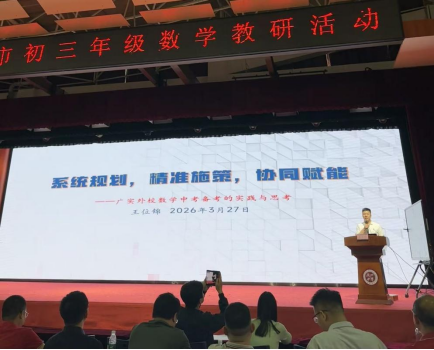 3 月 27 日,广州市 2025-2026学年下学期初三年级数学教研活动在广州中学五山校区顺利举行,本次活动以 “探索科学备考策略,发展数学核心素养” 为主题,采用线上线下融合的方式开展,全市初三数学教师参与学习交流。我校数学学科组长王位锦老师受邀在活动中作《系统规划、精准施策、协同赋能》专题讲座,分享我校数学中考备考的实践经验与思考。