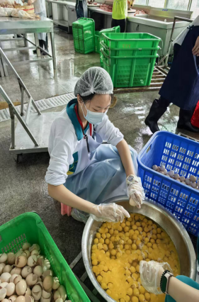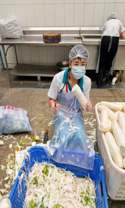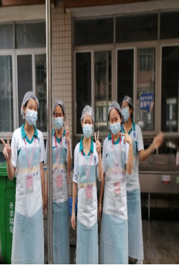 早上七点9名饭堂实践活动的同学就集中了,兵分两路,4名同学在初中部饭堂,5名同学在高中部饭堂,化身“食堂小帮手”。有的同学来到后厨,跟着厨师学习打鸡蛋、择菜,体验简单菜品的制作过程;有的负责为同学们分发加餐,每个环节都一丝不苟; “打饭的时候,我的手因为长时间端着餐盘变得酸痛,但当听到低年级同学说‘谢谢哥哥姐姐’时,所有的疲惫都消失了。”负责打饭的欧阳兆乐和黄晨曦同学说道。在体验过程中,同学们深刻体会到了食堂工作人员的辛苦——每天天不亮就要准备食材,在闷热的后厨忙碌数个小时,只为给全校师生提供可口安全卫生的饭菜。同学们要“光盘行动”。