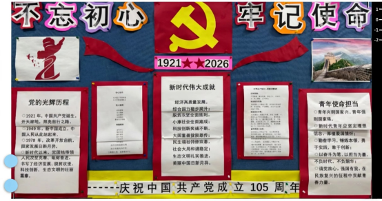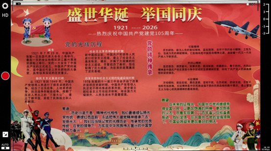 师生们分工协作、精心筹备,查资料、绘草图、写文案、涂色彩,将对党的崇敬、对祖国的热爱,尽数融入板报创作中。同学们在亲手绘制、共同创作的过程中,重温了党的光辉历史。一块块风格各异的板报,成为生活区最动人的红色风景,让每一位路过的同学都能驻足感悟,深受触动。