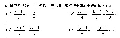 本题是这节课的重点和难点,这节课的内容能否掌握,就看这道题的掌握程度。通过上面的引入,我们已经初步体会到去分母的好处和具体的操作方法,那么对于这道题,同学们可以自己尝试去解答。这里应当全面放手给学生,学生会出现各种各样的解法,也会出现不同的错误。这是可以由学生来纠错并指出如何规避这些错误。由此我们可以得到去分母的注意事项。