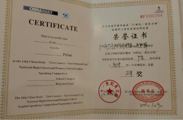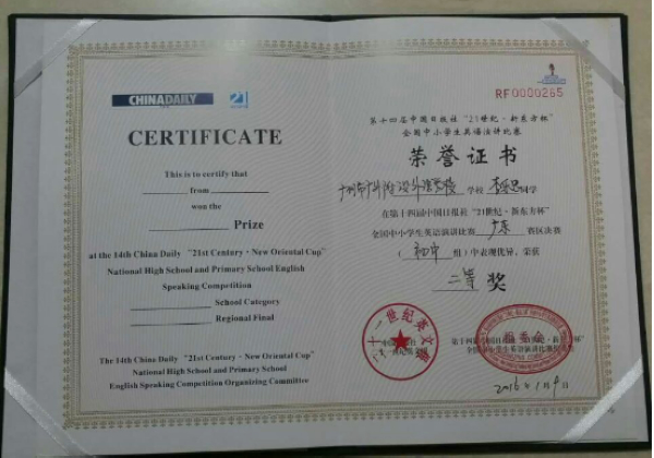 1月9日,第14届中国日报“21世纪--新东方杯”全国中小学生英语演讲比赛广东赛区决赛在广州举行。在初中组决赛中,我校初二年级赵耿楠获亚军,李乐思获二等奖。赵耿楠还获得3月份代表广东赛区参加全国总决赛的资格。