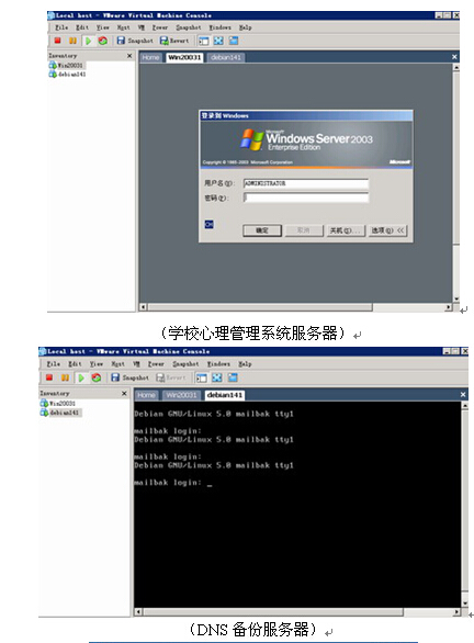 一般来说设置好虚拟机的光驱后,就可以点击“Start this virtual machine”来启动虚拟机了。为了方便起见,我一般 都将虚拟机的光驱指向一个安装盘 ISO 镜像文件。启动后的虚拟机就像我们平时用的电脑一样,正常安装就行了,包括系统的安全配置、 给系统打补丁、安装杀毒软件等。(需要提出的是,在虚拟机上安装系统时几乎可以不用考虑驱动程序的问题,因为虚拟机虚拟出来的硬件设备 都具有很高的兼容性。)如图一所示,图书馆服务器上一共装了两个虚拟机,一个Win2003系统,安装了“学校心理管理系统”; 另外一个是Debian Linux,安装了DNS服务,作为 172.16.14.14 DNS 服务器的备份服务器。图三是图书馆服务器的“任务管理器”,可以发现 CPU 的实时利用率还是很低的,只是系统内存使用率比较大,这是因为每台虚拟机都需要分配一定数量的物理内存。