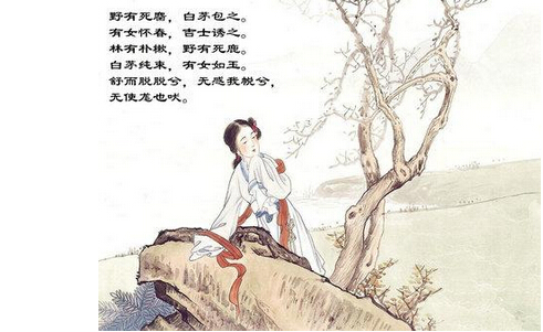我们先从最可靠的《诗经》里看看当时(春秋时)中等以下阶级的男女间的关系:号称周初的诗而实际上大半是西周以后的作品《召南》里有一首《野有死麕》,它叙述一个武士向一位闺女求爱的情形:“他用白茅包了一只死鹿,当作礼品,送给怀春而如玉的她。她接受了他的爱,轻轻对他说道:‘慢慢地来呀!不要拉我的手帕呀!狗在那里叫了!’”这首诗证明了那时的男子可以直接向女子求爱。男女们又有约期私会的,如《邶风》的《静女》的作者说:“美好的女儿在城角里等候我,我爱她,但找不见她,使我搔着头好没主意。她送给我一根红色的管子,又送给我一束荑草,这些东西是何等的好——唉,我哪里是爱的这些,只为它们是美人的赠品!”又如《鄘风》的《桑中》记着一位孟姜在桑中的地方等候她的情人,又在上宫迎接他;相会过之后,就到淇水上送他回去。我们看那时女子们的行动是何等的自由。她们可以到东门外像云一般的团聚游玩,她们可以同男朋友坐在一辆车上或并肩行走去游玩。