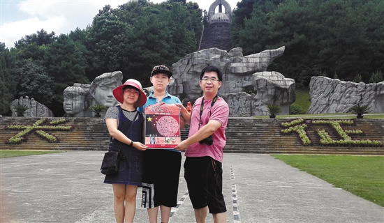 在红军长征突破湘江战役纪念公园(简称“湘江战役纪念公园”) 耗资4800万元新建成的纪念馆门口,来自广东的温斌一家人正在合影留念。这一家三口今年7月16日从广州环市东路出发,开始了半个月的“重走长征路”行程。