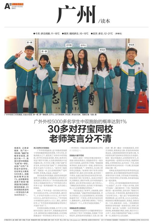 南都讯 记者梁艳燕 在广州一学校里,“撞脸”的概率非常高。原因只有一个,就是30多对双胞胎“扎堆”同一学校。这是广州市广外附设外语学校,在校学生大概有5000多人,双胞胎的概率达到1%。这种概率到底算不算高?据英国《每日邮报》曾经的报道,20对双胞胎就读同一所学校的几率为40万分之一。