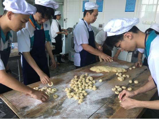 下午才是今天的高潮!期待许久的点心时间到!!大概两个半小时的时间里,我们尝试了制作肠仔包、肉包、油包等点心的过程,在师傅的引导下我们四个人从手忙脚乱“进化”到还“有点样子”(我们还被师傅夸有模有样了呢!)其中最艰难的莫过于平时最受同学们最欢迎的肉包,动起手来一点都不容易。肉包的馅了,褶皱和拿捏的力度都要刚刚好,稍有一点差错就可能揉成“大版汤圆”