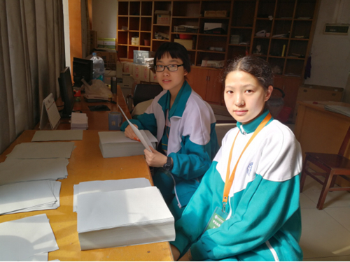 清晨,伴随着微弱的晨曦,饭堂小组的10位同学在六点二十五左右已陆续到达第一饭堂,拉开了本班实践活动的序幕。穿上白围裙,带上白帽子,脸上挂着标准的大口罩,便开始了忙碌的分工干活——分早餐、洗菜、切瓜……纵然在家里“十指不沾阳春水”,在这里也摇身一变成为“小厨师”,在厨房阿姨的指导下完成一个又一个任务。七点四十分,其余所有部门的同学也均已到位。图书馆里,在密集的书柜中穿行,嗅着厚重的书香,同学们亲手整理好图书的位置;校门校道上,沐浴着阳光,校卫队的同学们整装待发,精神抖擞;电视台的四名同学肩扛三脚架,手提摄像机,在校园里随机采访;“环卫工人”第一次穿上胶手套,在隐秘的角落仔细搜寻,手里的垃圾袋充实的同时,美丽了整个环境;毫不懈怠,一丝不苟,完成着举足轻重的办公室活儿,校办的“工作人员”不可小觑;而被分配到油印室的两位女同学不辞劳苦,一遍又一遍地重复着与枯燥的纸张打交道,也乐此不疲;生活部的同学在不起眼的宿舍岗位上也始终兢兢业业……而转到下午时光,同学们热情不减,以最饱满的态度进行今天工作的冲刺。