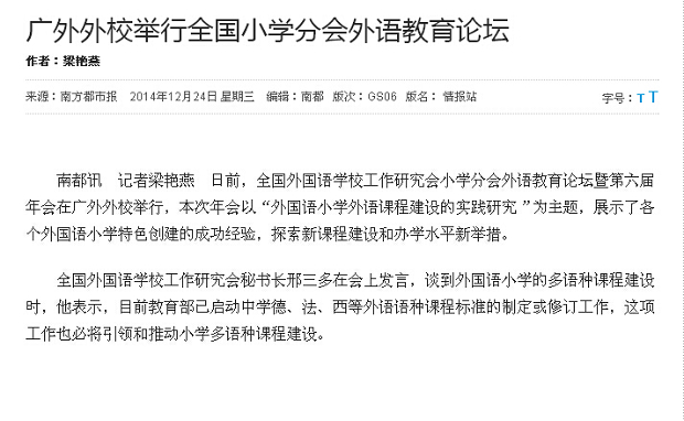 南方都市报:广外外校举行全国小学分会外语教育论坛