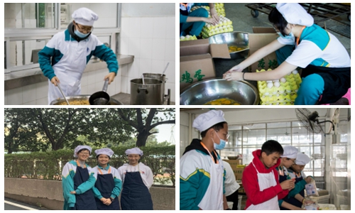 早早离开了舒适的被窝,饭堂的同学们到得格外早。穿上厨师服,戴上厨师帽,进入了一天的劳作。