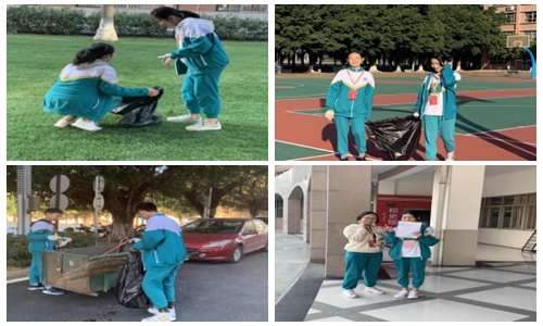 环卫是校园的美容师,一个看似清闲的活,考验的是我们的细致。参加环卫工作的同学有单梓琪,张艺蓝,周越,潘玥彤,邹添添,许诺言,刘俊毅和韩正浩。看,他们正拎着垃圾袋捡垃圾呢。