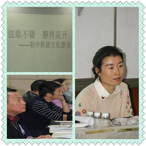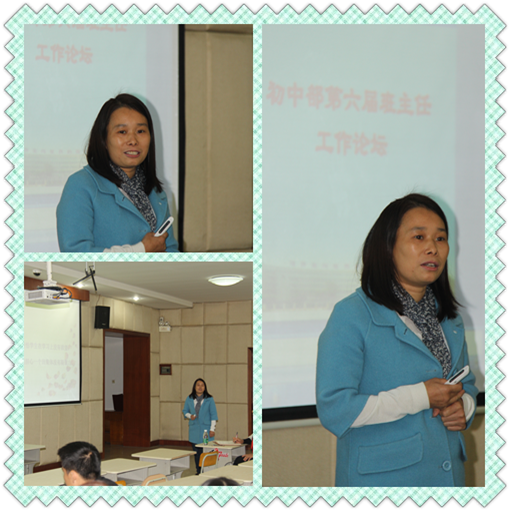 第三个发言的是张亚娟老师,张老师发言的主题非常富有诗情画意---《弦歌不辍,静待花开》!幽默的张老师借用网传新时期班主任专业标准作为开场白,这一“另类”的开场博得了全场老师的欢笑!张老师将“德育问题新常态”和“老革命和新问题”这两个主题作为切入点引出了自己的观点!张老师强调:“作为一线教师和班主任,我们在教育和管理学生的道路上要紧跟时代的脚步,单纯的教书迟早是要被淘汰的,我们不能只是单纯地做教书匠,而是要成为学生成长道路上的引导者。”张老师非常贴切的将班级管理分为三种类型:保姆型、经理型、领袖型!张老师说:“我们应该努力成为领袖型的班级管理者,作为一个班级管理者我们必须要懂得如何科学的育人,育什么样的人?要让他们拥有面对一丛野菊花怦然心动的情怀!”张老师的这一席话感情至深、发自肺腑,深深地感染了在场的每一位人,博得了全场热烈的掌声!
