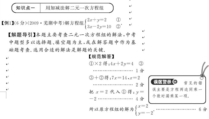 在技能训练化解中了解到学生解方程组时易出现疏忽具体步骤,重结果,轻过程。我从网络上下载了中考中对二元一次方程组在阅卷时的步骤要求,让学生感觉到过程同样重要。学生看后,惊讶不已,大家在后来的作业中明显注重了步骤的书写,减少了无为失误。(示范的作用不可忽视)下载内容如下: