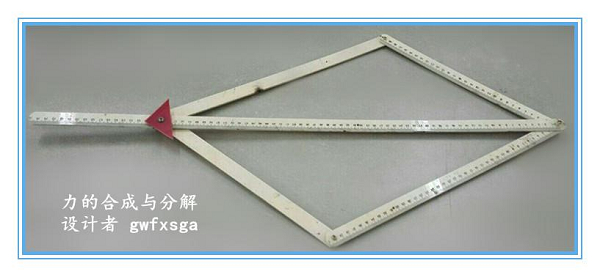 科学认知:在学习中,学生往往对合力和分力的大小产生误解,习惯认为合力比分力大,对合力和分力的方向也把握不准。通过此教具可以比较直观的看出,当两分力一定时,合力的大小在两分力差与两分力和之间变化,合力的方向随两分力之间的夹角的变化而变化。