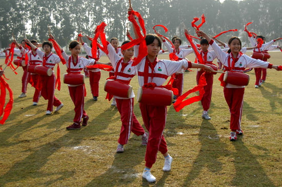 校学生运动会开幕式上,小学腰鼓队作精彩表演。