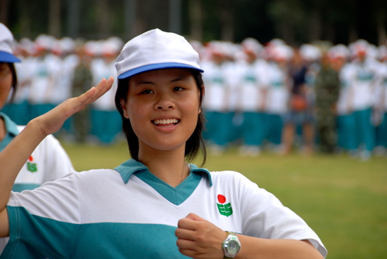 军训会操上,一位同学阳光自信的走过主席台。