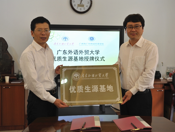 4月1日,广外优质生源基地授牌仪式在我校举行,广外教务处处长袁长青前来为我校授牌。我校校长万清华、副校长谢仁发、校办主任熊士军参加了授牌仪式。