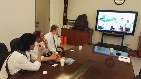 在二楼会议室,我校校长万清华、校办主任熊士军、国际部教学主任陈艳出席了洽谈会。