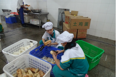 看!一个个头戴厨师帽,身穿围裙的小厨师们,正拿着刀,熟练地切萝卜……
