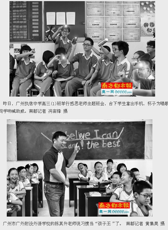 番禺执信中学的学生在教师节期间有了一项任务,便是帮老师上“执信头条”。“上课有多想放假,日后就有多怀念老师的课。”一位学生道出自己的心声。在学校的微信公众号上,不少同学上传跟老师朝夕相对的照片,大部分为老师上课的情景,并配有老师的口头禅。例如,有同学上传音乐老师在进行全班合唱排练的场景,图中配文:这位同学,你笑得这么开心,你上来唱这首歌。哎……这位同学的同桌笑得更开心,一块上来吧!