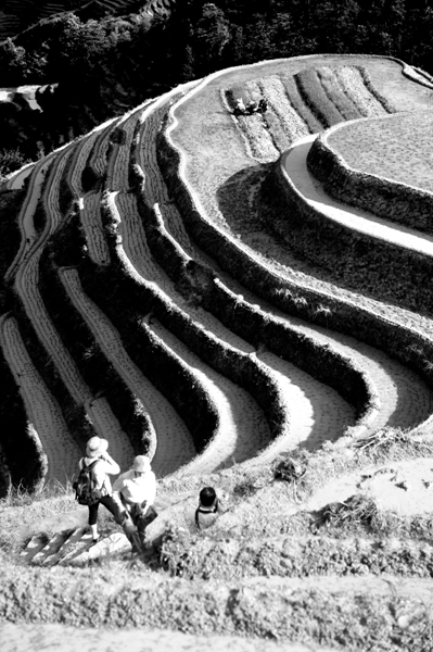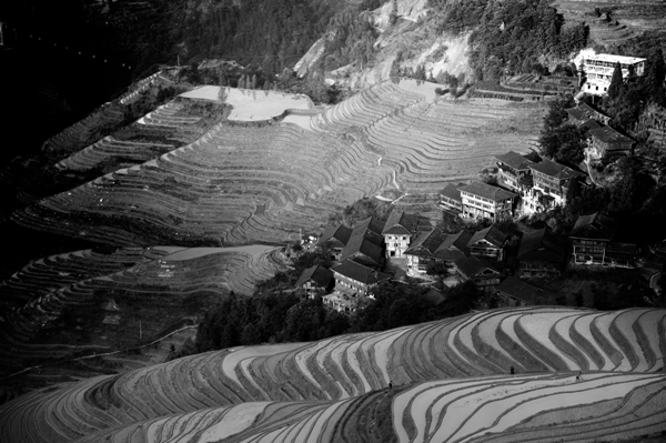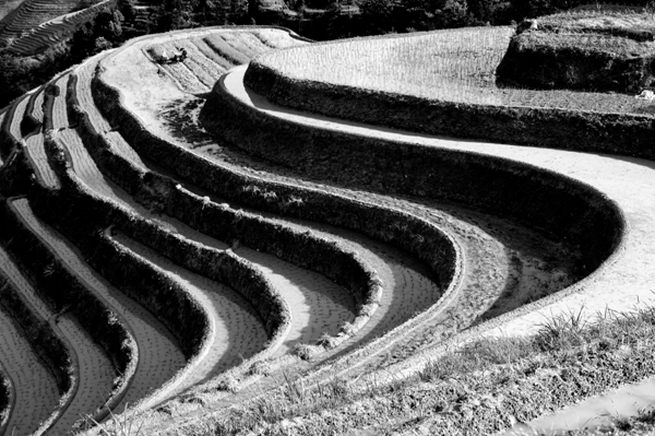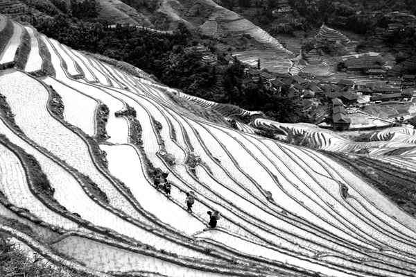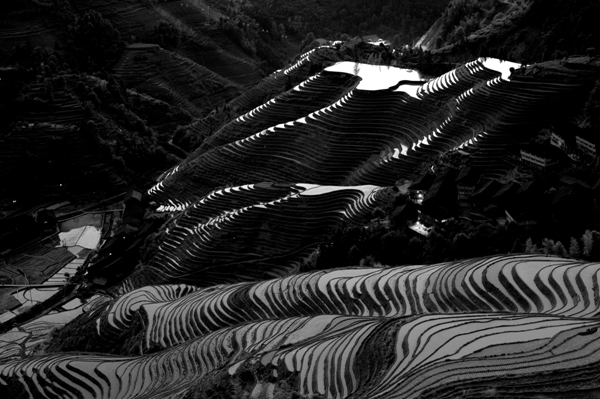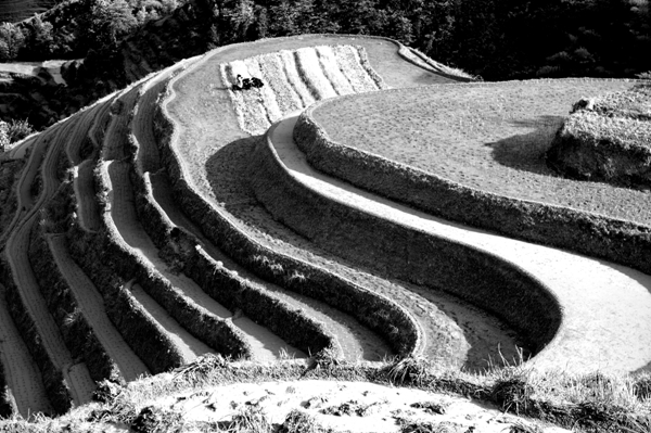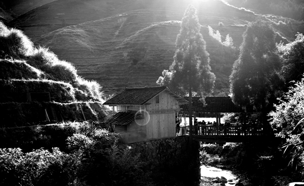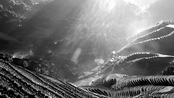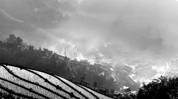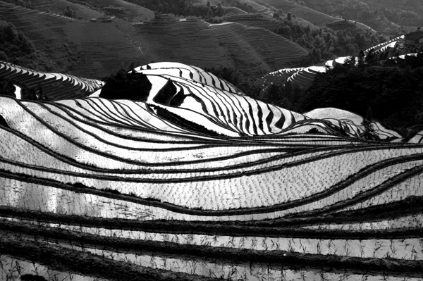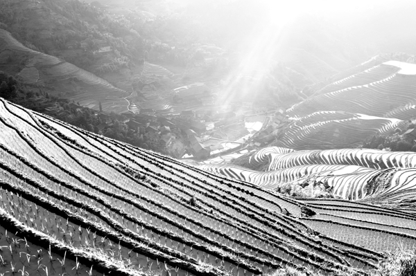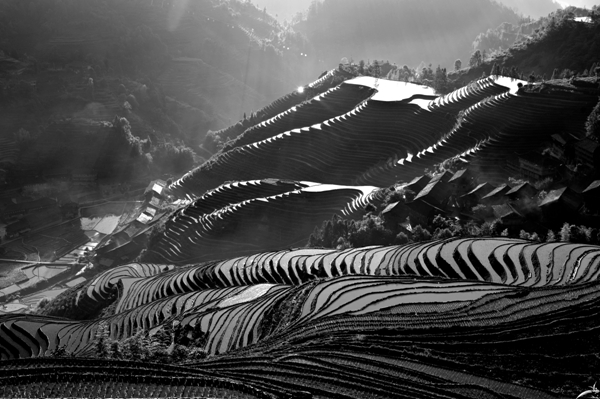 每年端午前后,梯田放水栽秧,漫山的秧田蜿蜒起伏,流动的光影千变万化,多少人为追逐那一道光线不惜千里万里,不怕山高路险;多少人为这凝固却又跳动的音符,常年守望不肯离去。作为一个常客,一年一次的行程,频率不高也不低,但每次面对它,都有新的感悟,新的理解——