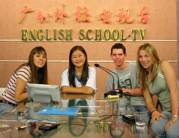 校电视台内,节目录制结束后,主持人朱迪思与嘉宾合影留念。这位思维敏捷、口齿伶俐的外校“第一代”主持人后来保送广外。