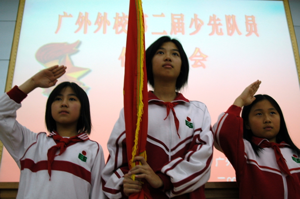 外校第二届少代会上,三位旗手出队旗。这三位同学进入中学后均成为团委学生会骨干,并成功保送。